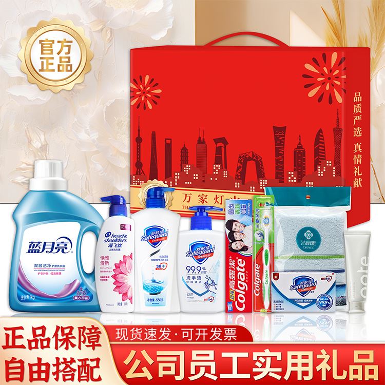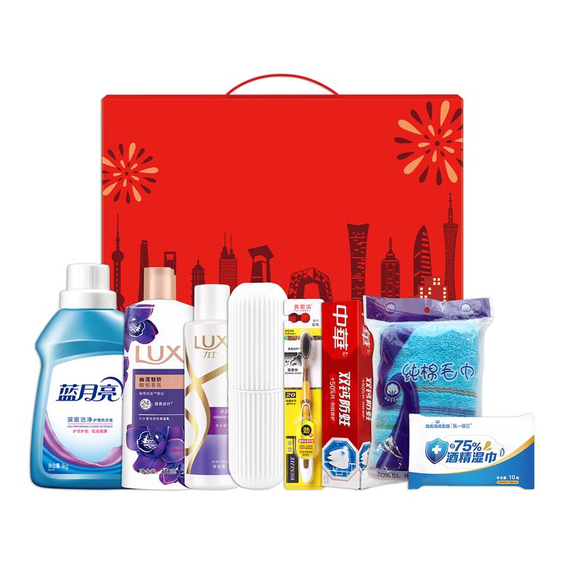 禮盒尺寸:32*8.5*24.5cm 包裝尺寸:66*46.5*51CM 產(chǎn)品配置:(香型隨機(jī)) 海氏海諾消毒濕巾10抽/包 藍(lán)月亮洗衣液1kg 力士洗發(fā)水200ml 力士沐浴露350ml 中華牙膏90g 優(yōu)思潔牙刷 純棉毛巾73*33cm 洗漱杯