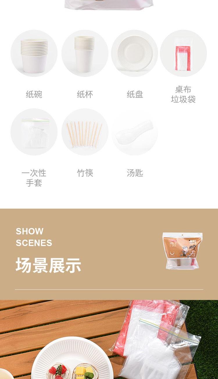 200mm一次性竹筷:10雙;180cmx180cm臺(tái)布:1張;650mmx600mmx0,015mm穿繩垃圾袋:2只