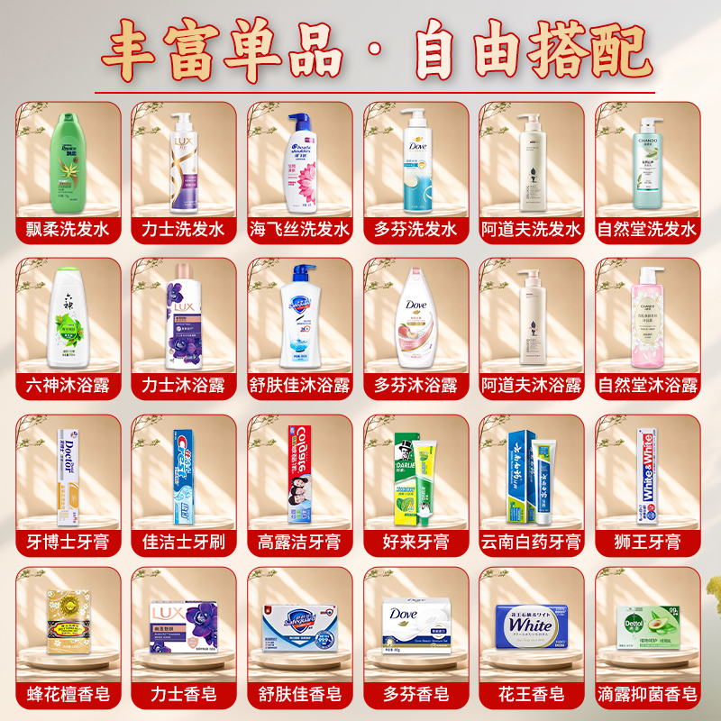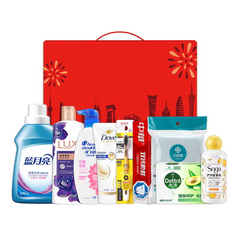 禮盒尺寸:32*8.5*24.5cm 包裝尺寸:66*46.5*51CM 產(chǎn)品配置:(香型隨機) 海飛些洗發(fā)水300ml 藍月亮洗衣液1kg 多芬護發(fā)素100ml SIGO留香珠220g 力士沐浴露350ml 滴露香皂105g 中華牙膏90g 優(yōu)思潔牙刷 潔麗雅毛巾69*33cm