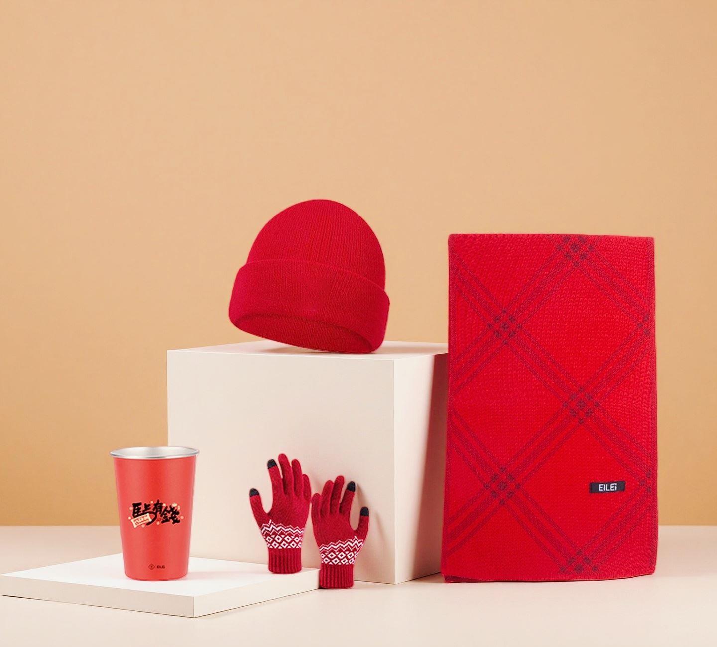 產(chǎn)品材質(zhì): 圍巾:晴綸+聚酯纖維 帽子手套:聚酯纖維 杯子:304不銹鋼 產(chǎn)品規(guī)格: 圍巾:180*30cm 帽子手套:均碼 杯子:350ml