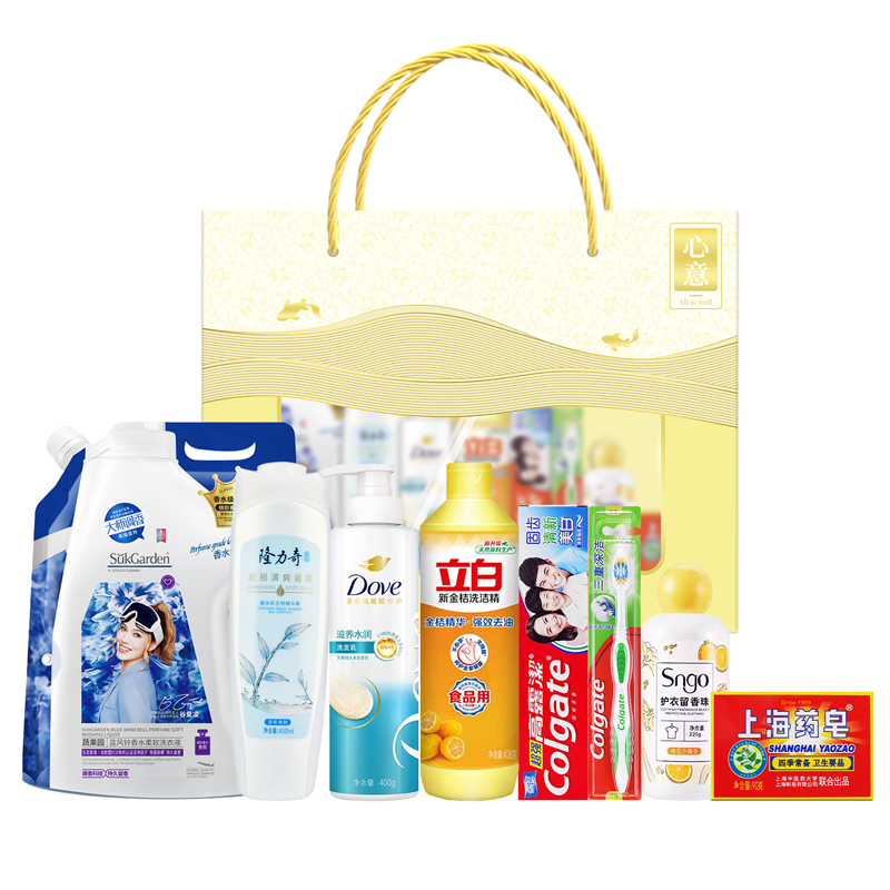 禮盒尺寸:40*13*28cm 包裝尺寸:42*80*30cm 產(chǎn)品配置:(香型隨機(jī)) 多芬洗發(fā)水 400m1 隆力奇沐浴露400ml 蔬果園洗衣液1kg SNGO留香珠220g 上海藥皂90g 高露潔牙膏90g 高露潔牙刷三重深潔 立白洗潔精408g